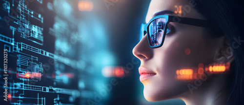 Woman wearing futuristic glasses, viewing digital data stream, technology concept