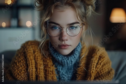 laptop, working, woman, home, work, goggles, couch, focused, room, remote, living, tied-up, from, technology, female, profession, comfortable, adult, productivity, 1, concentration, indoor, caucasian