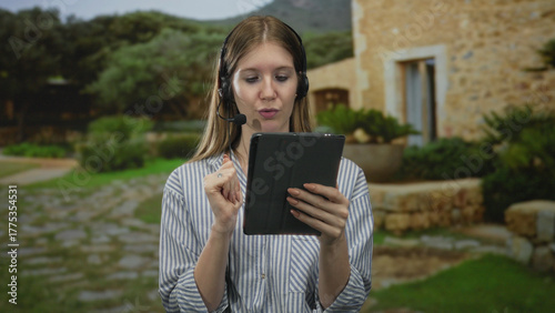 woman, tablet, tap, building, outdoors, female, device, contraption, headset, microphone, concentration, sharpened, attention, mindfulness, alertness, engagement, absorption, immersion, vigilance, cognition, touch screen, hand-held, technology, communication, remote, voice, audio, digital, electronic, screen, mobile, portable, wireless, innovation, stone, cobbled, plant, mountain, shrub, gesture, multitask, interaction, user, interface, app, mic, earphones, virtual, digitization