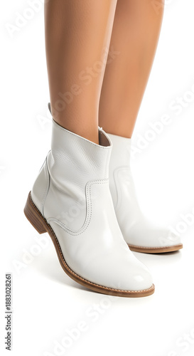 Woman wearing white leather ankle boots.