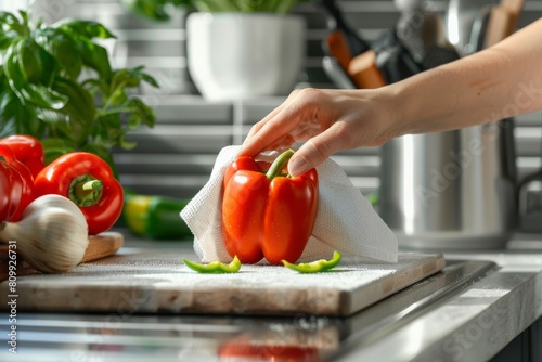 woman, wiping, bell, pepper, paper, towel, kitchen, preparing, freezing, washing, vegetable, closeup, space, text, product, hygiene, hygienic, housekeeping, generative, ai, illustration, cleaning, tissue, water, background, person, food, home, white, adult, care, domestic, pepper, sanitary, napkin, dry, disposable, tap, housework, selective, chore, clean, female, sharpened, fresh, household, soft, towel, wipe