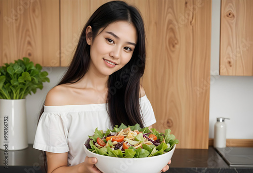 woman, food, kitchen, salad, cooking, eating, diet, home, healthy, meal, vegetable, fresh, smiling, vegetable, eat, lunch, smile, cook, holding, nourishment, lifestyle, person, tomatoes, organic, people