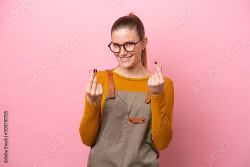 Woman with apron isolated on pink background making money gesture