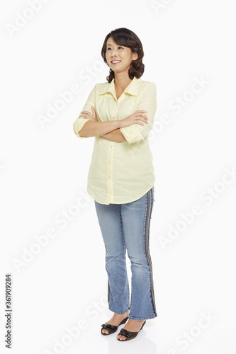 standing, smiling, color image, full-length, half face, isolated, idea, japanese, individuality, femininity, simplicity, cheerful, confidence, happy, happiness, individual, feminine, asian, japan, simple, mature, woman, asian ethnicity, japanese ethnicity, mature woman, one person, cut-out, casual clothes, arms crossed, adults only, studio shot