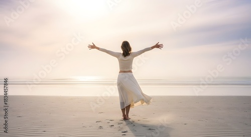 woman, beach, sunrise, ocean, arm, outstretched, freedom, joy, peace, serenity, nature, coast, sand, water, sky, light, dawn, morning, silhouette, figure, dress, white, standing, back, view, horizon, wave, sea, calm, tranquil, escape, vacation, travel, journey, adventure, exploration, discovery, hope, inspiration, empowerment, happiness, bliss, solitude, alone, meditation, spiritual, wellness, lifestyle