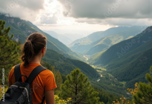 woman, backpack, mountain, vale, landscape, nature, scenic, hill, cloud, greenery, travel, adventure, exploration, horizon, forest, tree, sky, view, peaceful, wilderness, hiking, journey, environment, countryside, tour tourism, cloudscape, greenland, hilltop, calmness