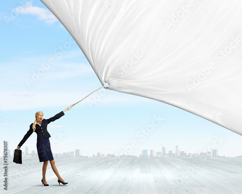 advertisement, billboard, business, curtain, advert, lead, blank, banner, caucasian, rope, success, marketing, presentation, white, female, signs, girl, advertise, businesswoman, sale, empty, presenting, board, card, announcement, young