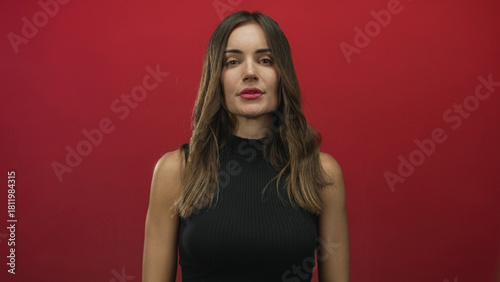 Woman with bare shoulders looking down in red studio with neutral expression; serenity introspection.