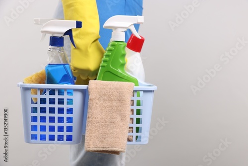 Woman with basket of cleaning supplies on light background, closeup. Space for text