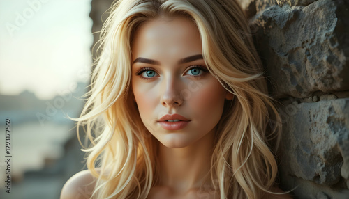 woman, posing, hair, blond, fair, skin, blue, eye, looking, face, portrait, closeup, beauty, stone, wall, daylight, shoulder, serene, calm, style, fashion, adult, female, young, person, near, leaning, neutral, expression, artificial, intelligence, generated, image, background, soft, light, eye, contact, single, head, and, shoulder, lifestyle, elegance, natural, pretty, portraiture