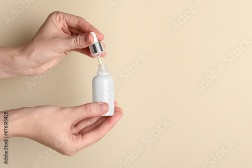 Woman with bottle of cosmetic serum and dropper on beige background, closeup. Space for text