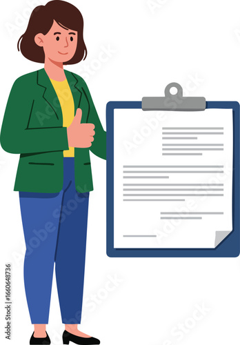 woman, clipboard, thumb up, gesture, document, paper, green, jacket, blue, pant, casual attire, business, standing, approval, confidence, smile, flat, design, vector, illustration, people, female, office, work, success, communication, positive, posture, hand, expression, character, person, professional, manager, employee, career, adult, lifestyle, isolated, white background, icon, signs, symbol, concept, happy, casual clothes, cheerful