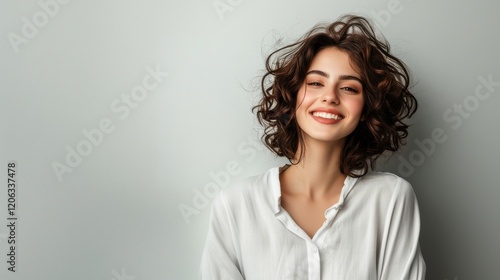 Woman with curly beautiful hair wearing a shirt on a gray background. Short wavy hairstyle.