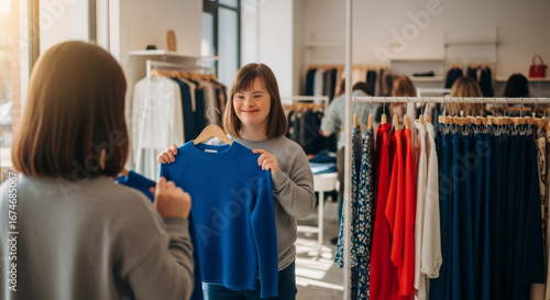 down's syndrome, woman, person, shop, mirror, holding, sweater, happy, joy, store, commerce, retail, shopping, clothes, clothing, fashion, sale, choice, client, consumer, disability, inclusive, inclusion, diversity, lifestyle, casual attire, modern, adult, indoor, interior, trying, choose, female, youth, young, teenage, childhood, emotion, smile, laughing, glad, positive, optimistic, face, portrait, market, buy