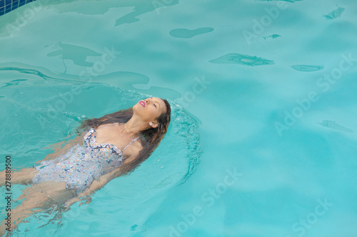 beautiful, pretty, swimwear, sunny, summer, backyard, swimming pool, pool, water, turquoise, home, authentic, wet, relaxed, eyes closed, swimming, floating, float, hobby, escapism, carefree, freedom, modern, recreation, leisure, lifestyle
