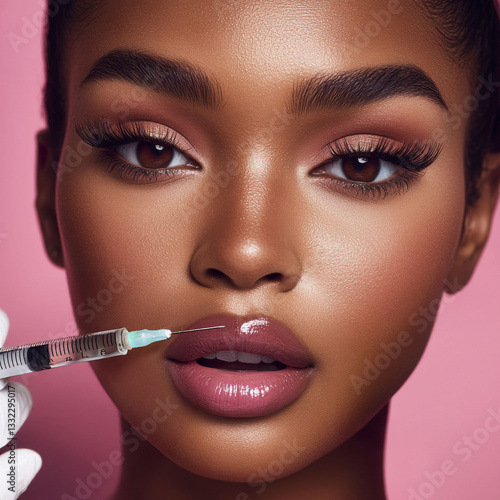 african american, black woman, injection, african, black hair, woman, beauty, cosmetic, lip, skin, make-up, syringe, treatment, skincare, aesthetic, procedure, face, closeup, glamour, fashion, model, portrait, smooth, glowing, youthful, elegance, perfection, luxury, wellness