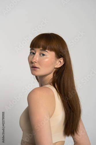 Woman with freckled skin and long ginger hair with bang posing at the studio