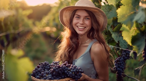 woman, agriculture, portrait, nature, wine, healthy, vinery, lifestyle, grape, smiling, female, happiness, fruit, sunset, joy, harvest, farmer, sunlight, green, beauty, hat, summer, casual attire, outdoors, cheerful, basket, organic, adult, vinification, farming, caucasian, vine-growing, rural, grapevine, freshness, clothing, vine, agricultural, natural, field, brunette, produce, country