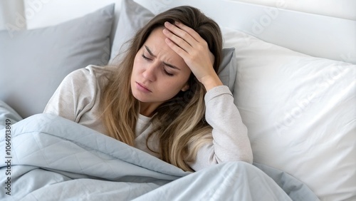 Woman with headache lying in bed feeling unwell