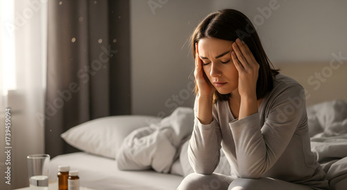 woman, cephalalgia, pain, stress, bed, bedchamber, medicine, bottle, glasses, disease, sleepy, fatigue, discomfort, health, indoor, casual attire, long hair, sitting, female, adult, suffering, unwell, tiredness, home, morning, light, natural light, curtain, pillow, blanket, resting, wellness, health care, treatment, symptom, health care, lifestyle, emotional, upset, recovery