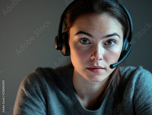 Woman with headset and microphone, wearing a face mask and looking into camera. She appears focused on her work. A modern office setting with soft lighting.