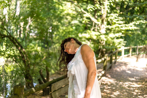 cute, dangling, green, hair, head, horizontal, leaf, mature, nature, outdoors, position, woman