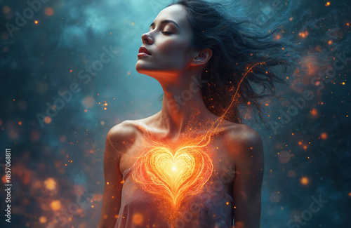 Woman with inner light glowing from chest area, conveying energy and peace. Spiritual glow emanates, surrounded by mystical sparks and dark blue background, calm meditative mood.
