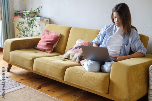 Woman with laptop sitting on the sofa at home