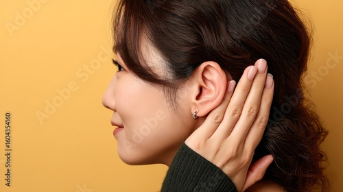 woman, long, brown, hair, wearing, earring, smiling, holding, hand, female, young, face, person, beauty, adult, care, health, attractive, hear, noise, white, listen, natural, head, pretty, sound, skin, portrait, healthy, pain, wellness, facial, clean, ache, treatment, background, human, model, disease, honed, make-up, closeup, medicals, skincare, inflammation, freshness, infection, lady, deaf