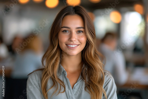 Woman With Long Hair Smiling at the Camera in a Business Setting