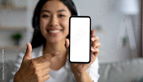 Woman with modern smartphone and headphones at home, 300 dpi, widescreen 16:9, with free space for text