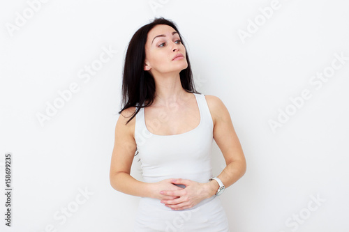 Woman with pain is holding her aching belly