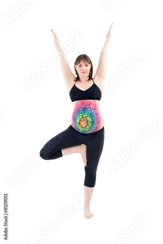 woman, yoga, standing, belly, pregnant, painted, painting, body, art, exercise, practicing, healthy, up, lifestyle, care, abdomen, stomach, 30s, caucasian, indoor, studio, relaxation, health, mother, eltern, sport, recreation, alternative, beautiful, pose, position, well-being, white background, young, front view