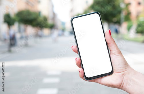 Woman with red nails hold a blank screen smartphone on an empty street