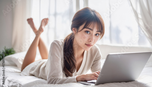 asian, woman, beauty, serene, bang, hair, lying, bed, laptop, work, relaxation, technology, indoor, home, productivity, sharpened, modern, lifestyle, multitask, business, professional, study, education, online, digital, communication, cyberspace, connectivity, wireless
