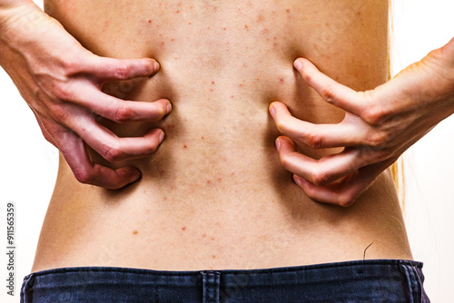 back, acne, problem, skin, pimple, scratching, woman, rash, dermatology, disease, allergy, dermatitis, itchy, scar, adolescence, teenage, body, teenage, spot, scratch, itch, finger, hand