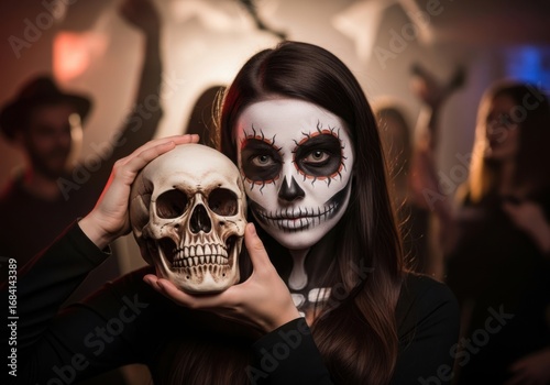 woman, skull, make-up, face, paint, art, halloween, costume, party, celebration, event, gathering, people, crowd, dark, night, indoor, lighting, atmosphere, skittish, scarey, creepy, horror, death, skeleton, bone, prop, holding, object, detail