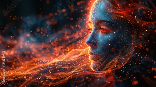 woman, face, female, sparkle, glowing, light, abstract, art, digital, fantasy, portrait, red, orange, blue, dark, beauty, magic, mystical, dream, imagination, bright, texture, colourful, hallucinogen, surreal, cosmic, energy, sparkling, fire, particle, glistering, dust, swirled, design, pattern, artistic, creative