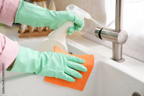 adult, background, bottle, care, chore, clean, cleaner, cleaning, cleanliness, closeup, detergent, domestic, dust, female, glove, hand, home, house, housecleaning, household, housekeeping, homemaker, housework, hygiene, indoor, kitchen, lifestyle, maid, napkin, orange, person, purity, rag, room, routine, sanitary, service, sink, spray, tap, tidy, laundered, washing, white, wiping, woman, work