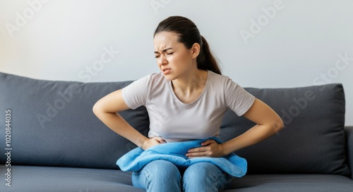 woman, female, adult, pain, ache, discomfort, stomach, belly, abdomen, sick, unwell, disease, medicals, health care, health, treatment, heating, pad, heat, compress, warm, relief, comfort, sofa, sitting, couch, home, inside, indoor, casual attire, clothes, t-shirt, jean, light, bright, white, grey, blue, holding, hand, hand, closeup, expression, face, worried, concerned, distressed, stressful, suffering