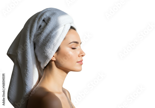 woman, female, beauty, skin, care, hair, towel, head, face, profile, side, view, young, adult, person, model, studio, light, shadow, clean, fresh, natural, healthy, serene, peaceful, relaxed, wellness, spa, treatment, hydratation