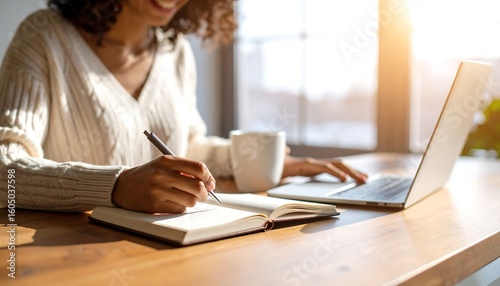 woman, working, laptop, notebook, pen, hot drink, sunlight, desk, focused, writing, note, home, office, productive, technology, digital, learning, study, creative, comfortable, cosy, bright, warm, natural light, hand, personal computer, modern, business