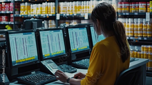 woman, computer, retail, working, store, inventory, monitor, technology, business, analysis, employee, datum, transaction, screen, modern, information, organisation, productivity, tool, office, sale, client, background, yellow, casual attire, lifestyle, workstation, communication, machine, shopping, analytical, desk, workspace, check, program, system, display, calculation, control, support, work, management, balance, professional, focused, commerce, item, software, shelf