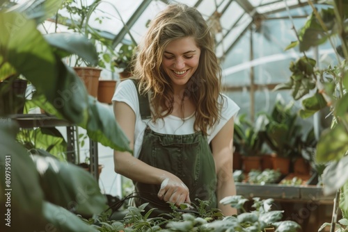 woman working in greenhouse. Seedling nursery. Smart farming, innovative organic agriculture