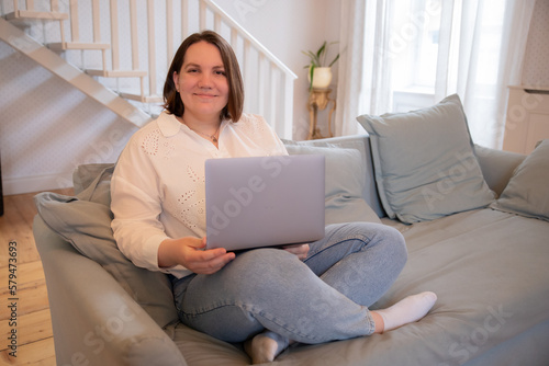 laptop, woman, computer, home, cyberspace, sofa, couch, beauty, technology, smile, lifestyle, notebook, sitting, person, casual attire, communication, online, people, leisure, house, room, smiling, brunette, indoor, living