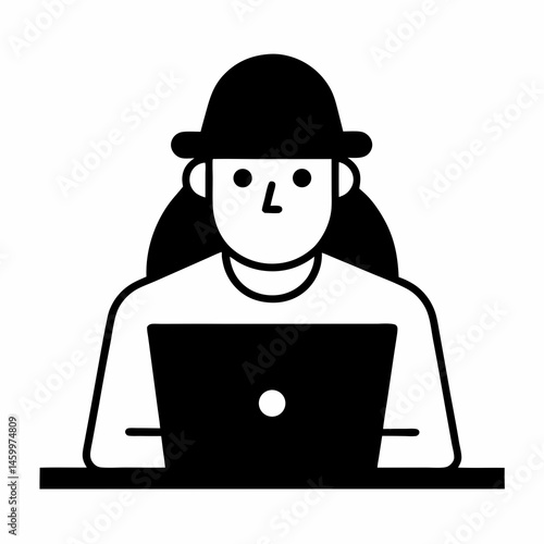 woman, laptop, computer, working, hat, girl, business, office, freelancer, student, online, learning, education, study, desk, table, monochrome, black-and-white, vector, illustration, icon, graphic, avatar, user, profile, developer, programmer, isolated, minimalist