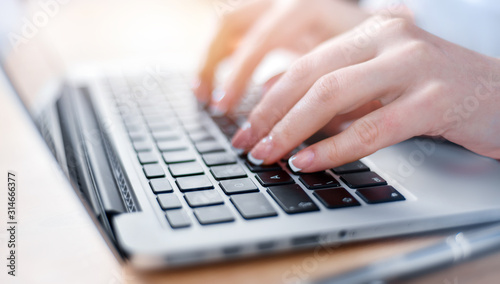 Woman working on modern computer. Laptop keyboard detail with beautiful nails hand.