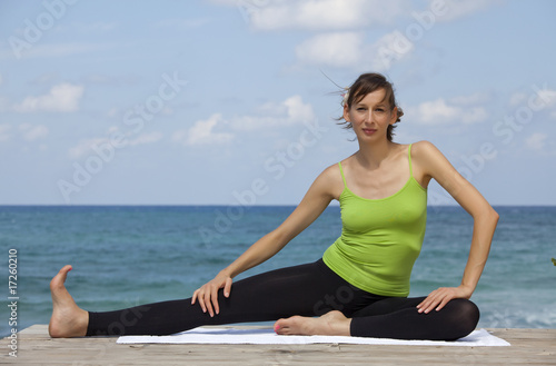 active, female, fitness, woman, physical exercise, sport, leisure, happiness, wellness, relaxing, exercise, ocean, wave, vacation, leggings, barefoot beach, yoga, sky, beach, shore, healthy, movement, towel