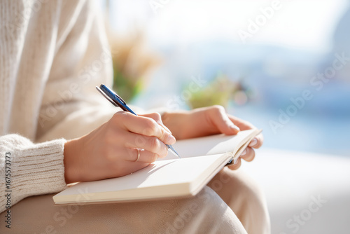 Woman writing in a notebook with a pen, cozy atmosphere and soft natural light in the background