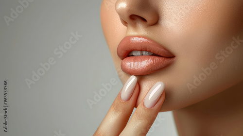 woman's face with smooth skin and manicured nails touching her chin and beautiful tight lips